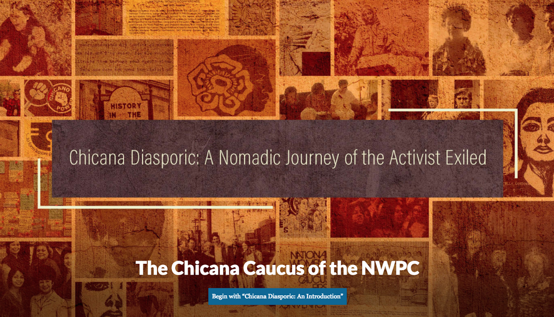 Chicana Diasporic, A Nomadic Journey of the Activist Exiled, is a media rich, annotated Scalar research hub that highlights a political/ideological journey of the women of the Chicana Caucus of the National Women’s Political Caucus (NWPC) from 1973 to 1979. Presented in a museum collection format, this interdisciplinary exploration of the Chicana Caucus includes speeches, correspondence, event posters, photographs, filmed interview clips, an introductory narrative and timeline that defines the Caucus’ history, structure and purpose, and their national impact on 1970s second wave feminism.