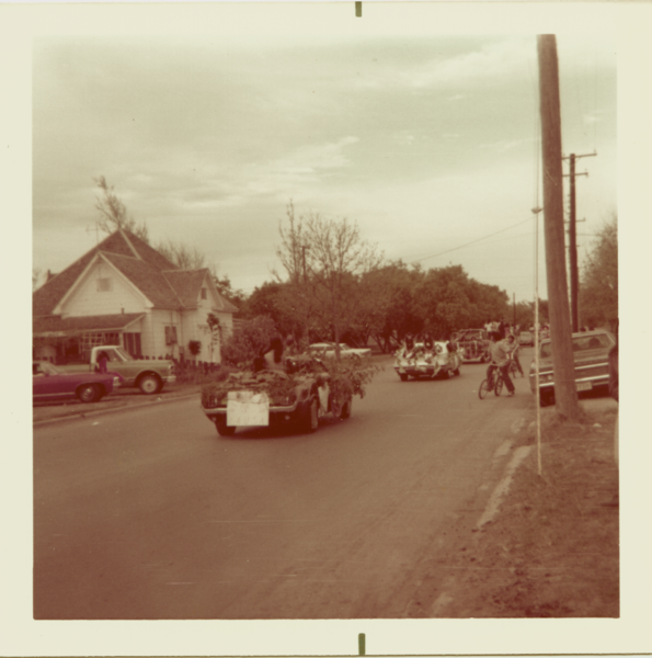 Photo of a Raza Unida Party parade in Crystal City, Texas taken by Enriqueta Chavez. Cars in the parade proceed down the street of a residential area.
