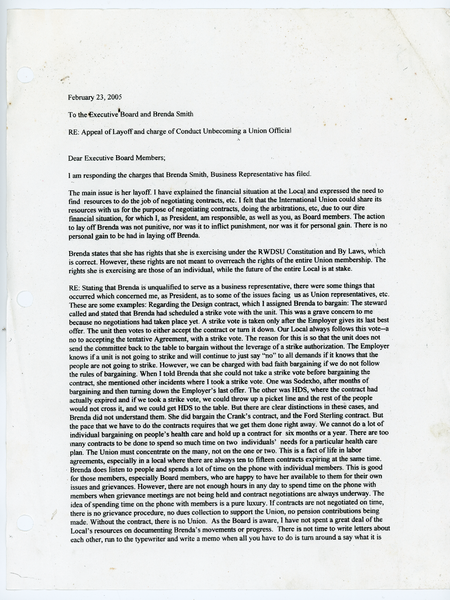 Letter to the Executive Board and Brenda Smith about the Appeal of Layoff and charge of Conduct Unbecoming a Union Official