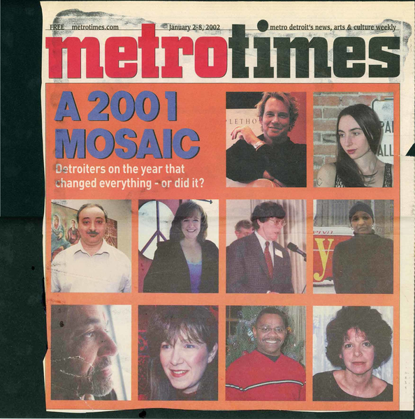 Front page of the Detroit Metro Times from January 2, 2002 that features a photograph of Elena Herrada as a Detroiter commenting on the year 2001.