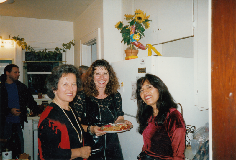 A photo of Pat Zaharopoulos and two others, possibly Rita Sanchez, at a housewarming.