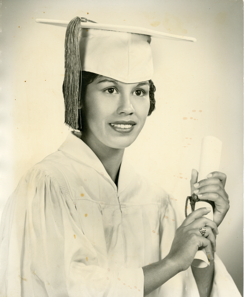 Photo of Emily dressed in her high school graduation cap & gown in 1959