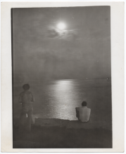 Black and white photo of a man and woman admiring the moon reflected in the ocean at night |