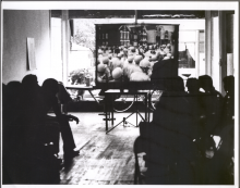 Black and white photograph of a movie night put on by "mujeres palias" after a police riot |