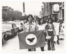 Black and white photo of NEIU Students at a UFW Protest, walking down the street, in Chicago 1977 |