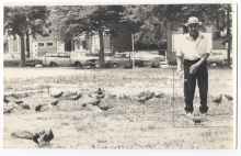 Image of older gentleman in a gated park feeding pigeons with houses and cars in the background. Appears to be in the Pilsen neighborhood of Chicago in the 1970s. Images shows crop marks. |