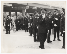 Black and white photograph of a crowd of male police officers outside. There is a welcome banner in the background. |