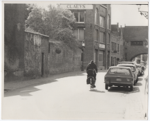 Black and white photograph of a priest riding a bike down the street probably somewhere in Europe. |