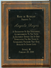 Angela Reyes was awarded the Community Service Award from the Detroit City Board of Education for her commitment to gang violence prevention. |