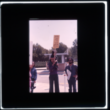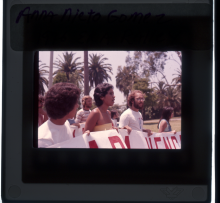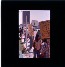 Rally in support of Anna Nieto Gomez in her 1976 tenure battle at California State-Northridge; two protesters carry signs which read: "Fight SEXISM In Higher Education! Join RALLY to Support ANNA NIETO GOMEZ MON, May 17 - 10 A.M.-12 Noon" |
