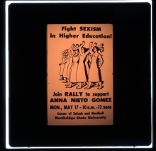 Poster for rally in support of Anna Nieto Gomez in her 1976 tenure battle at California State-Northridge. The poster reads: "Fight SEXISM In Higher Education! Join RALLY to Support ANNA NIETO GOMEZ MON, May 17 - 10 A.M.-12 Noon Corner of Zelzah and Nordhoff Northridge State University |