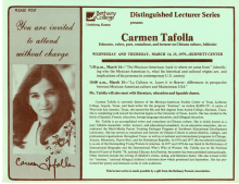 Flyer advertising Carmen Tafolla's presentations/lectures at Bethany College as part of a Distinguished Lecturer Series; March 14-15 1979. |