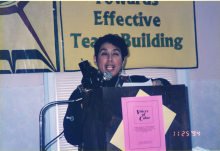 Elena M. Herrada at her desk at Local 1064 offices in Southfield, Michigan, spring 2002; she's about to turn age 45 |