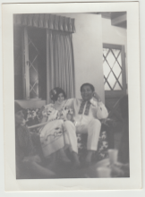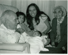 Photograph of a young Rita Sanchez with two young children and two older family members. |
