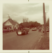 Photo of a Raza Unida Party parade in Crystal City, Texas taken by Enriqueta Chavez. Cars in the parade proceed down the street of a residential area. |