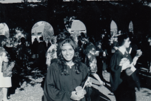 A black and white photo of Rita Sanchez at her graduation from Stanford University in 1974. |
