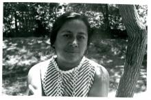 Black and white portrait of Enriqueta Vasquez standing outside. The back reads: "Figure 6 Enriqueta Vasquez." Photo taken in 1969 at El Grito headquarters by Betita Martinez. |
