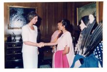 Color, group photo of Enriqueta shaking hand of Reina Sophia, queen of Spain, in 1992. Indigenous woman in foreground in profile. As "part of an intertribal indigenous delegation," Enriqueta traveled to Spain in 1992 for the 500-year anniversary of Christopher Columbus' voyage to the Americas. The delegation "provided through speeches and ceremony a counter-balance to the nation's festivities marking the anniversary" (Enriqueta Vasquez and the Chicano Movement, xliii). |