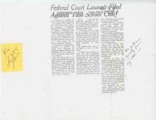 A newspaper article titled "Federal Court Lawsuit Filed Against Taos School Chief" in the Albuquerque Journal on May 8, 1970. The article covers Enriqueta Vasquez's filing of a federal lawsuit against Taos Junior High School, her daughter Ramona's school. Ramona wore an armband and a Mao Zedong pin to school, but both were confiscated by school authorities and a memorandum was issued banning "these trouble-making devices." |