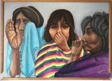 A colorful mural of three women of different ages holding their noses and looking away from the viewer. By Enriqueta Vasquez. |