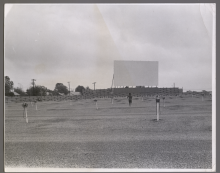 Image of a woman at a drive-in cinema running from the camera towards the theater screen |