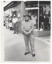 Black and white photograph of a man posing in front of a McCrory five-and-dime with others in the background |