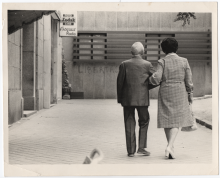 Black and white photo of an unknown older coupld walking away from the camera, grafiti reads "libertad" |