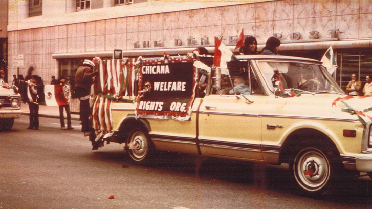 Photo of the Chicana Welfare Rights Organization float in the Denver Crusade for Justice, a Chicano civil rights organization, parade in front of the Denver post office.