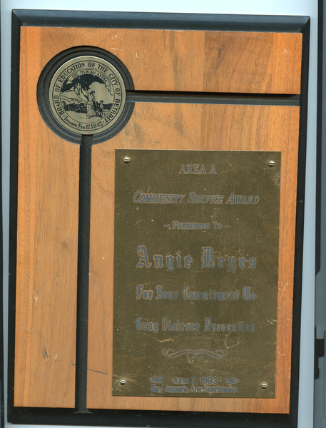 Angela Reyes was awarded the Community Service Award from the Detroit City Board of Education for her commitment to gang violence prevention.