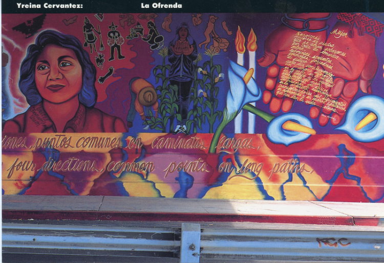 Mural ‎La Ofrenda is a dedication to immigrants, political exiles, and all immigrants. Cervántez attempts to put into context the struggles in Latin America in the 70s with the Chicano/Chicana struggle in the US. Common struggle is the theme. Cervántez depicts the positive and transformative role that women play in creating change by having Dolores Huerta be the central figure of the piece. There are references to indigenous spirituality such as the burning the copal and the sage. Rosanna Martin
