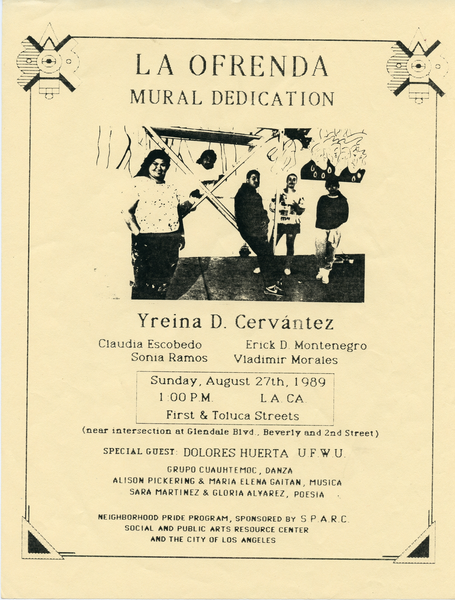 Flyer announcing the La Ofrenda mural dedication hosted by the Neighborhood Pride Program, sponsered by Social And Public Arts Resource Center (S.P.A.R.K) and the city of Los Angeles. It shares that the dedication will be held Sunday, August 27th, 1989 at First & Toluca Streets. Dolores Huerta from the United Farm Workers (U.F.W.U) is announced to be a special guest. Cervántez along with Claudia Escobedo, Sonia Ramos, Erick D. Montenegro, Vladimir Morales are listed to attend the mural dedicatio