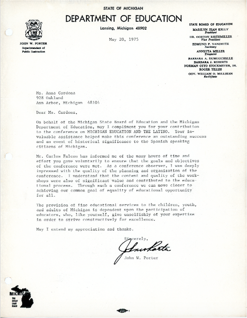Letter Thanking Ana Cardona for participation in conference on Michigan Education and the Latino