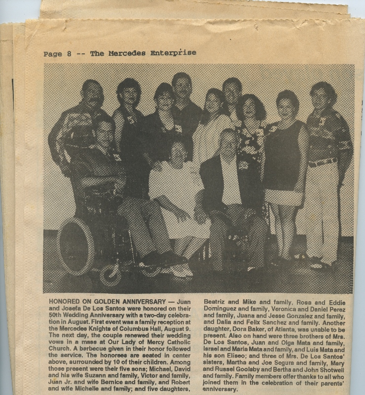 Family photo appearing in newspaper article of 50th wedding anniversary of Juana's parents.