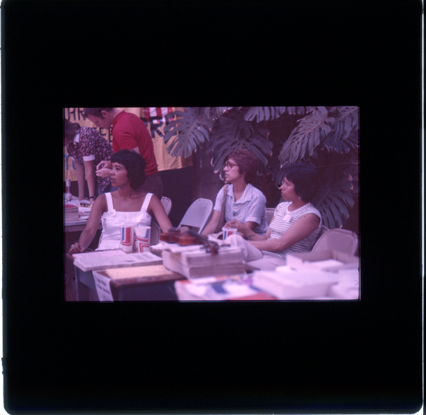 Anna Nieto Gomez, Rosa Maria Marquez, and Corinne Sanchez tabling as the support committee for Encuentro Feminil