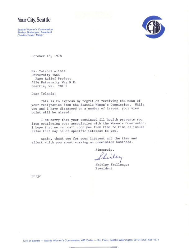 A letter from Shirley Skellenger, then president of the Seattle Women's commission expressing regret on receiving news of Yolanda's resignation due to ill health